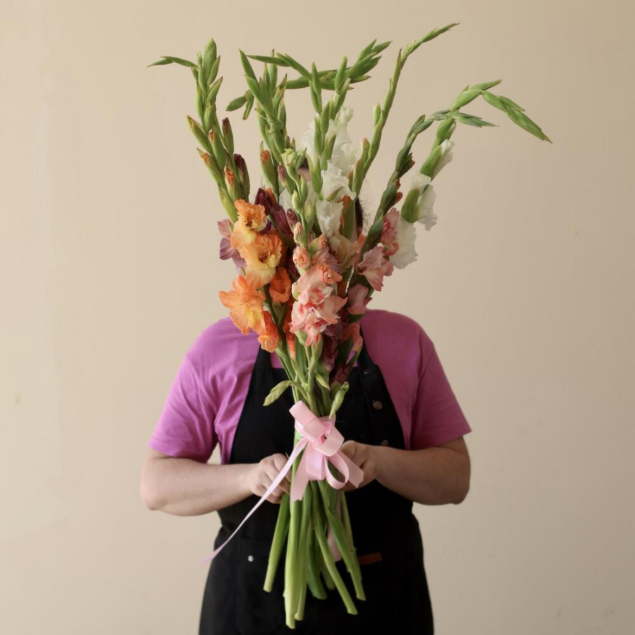 На фото букет из 11 разноцветных гладиолусов. В составе: гладиолус 11 шт, атласная лента 1 шт, . Все цветы свежие и ароматные, букет красиво оформлен и отлично подходит для подарка. Доступна доставка цветов или самовывоз.