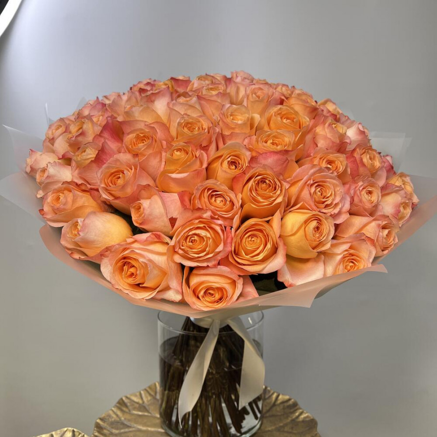 На фото букет из 75 коралловых роз. В составе: роза 75 шт, дизайнерская упаковка 1 шт, атласная лента 1 шт, . Все цветы свежие и ароматные, букет красиво оформлен и отлично подходит для подарка. Доступна доставка цветов или самовывоз.